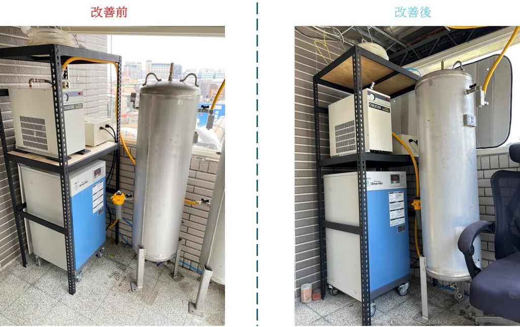 空壓機系統廠商與客戶討論後同意客戶對於空壓機系統設備放置的位置之後,基本上就不應該再拿客戶的環境不佳影響空壓機系統設備的穩定性造成故障來說嘴了;我們也會有失誤的時候,以下案例是接近冬季與春季交替時節,雖然客戶設計了擋雨的玻璃而我們因此認同將空壓機系統放置在戶外頂樓;等到我們夏天去做免費巡迴檢查服務時,服務同仁發現我們沒有考慮到夏天日曬會直接照射到乾燥機、空壓機的電氣部品與空氣桶上方1/3的桶身,因此必須幫客戶做隔熱防曬的方案措施,以確保客戶用氣的穩定性。