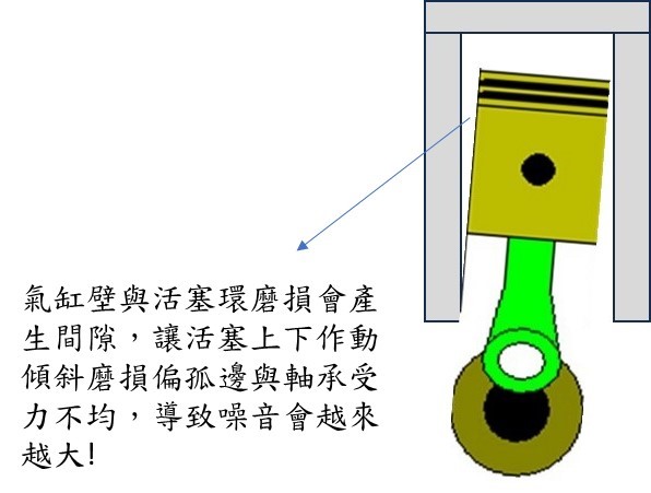 我們以往復式空壓機機體的活塞與氣缸來說明,為避免因為活塞環與壓縮環 (下圖綠黃色示意的活塞上方有兩條C扣設計的環) 快速磨損造成間隙變大以及導程卡損到氣缸壁造成卡死,工業級往復式空壓機為確保可靠度與確保能效風量,在機構設計上活塞與連桿機構