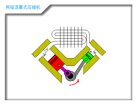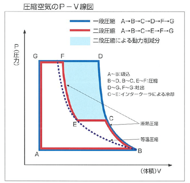 確保風量維持與新機一樣的技術之後,為減少因為壓縮負荷加速活塞環以及壓縮環的磨耗,並且取得更好的馬達耗功耗電以及降低震動噪音;日本岩田無油往復式空壓機1.5kW (2馬力) 以上機型採用機體雙段壓縮 (請參考上圖與上上圖 活塞有LP第一段低壓活塞氣缸組以及HP第二段高壓活塞氣缸組) 設計,大大增加了空壓機的能效 (請參考下圖單段壓縮與雙段壓縮的能耗情況)。雙段壓縮過程因為每一組活塞壓縮比相對小很多,因此電能轉換成動能並間接變成無法產生風量的熱能情況將會大幅降低。