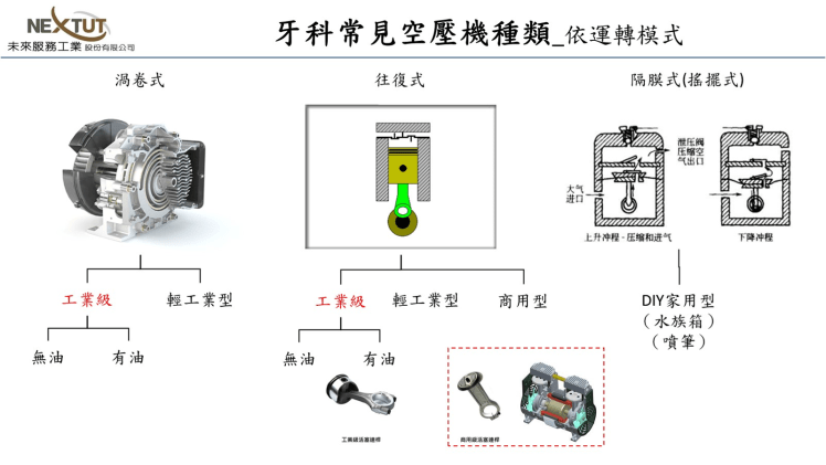 牙科常見的空壓機種類如下圖所示意的有 渦卷式、往復式與隔膜式 (或稱搖擺式;因為隔膜式空壓機的膜片容易破損且風量較小,因此逐漸被淘汰中,日本岩田並不提供此類介於DIY與商用型之間的產品)。當然渦卷式空壓機又有區分為工業級以及輕工業型兩類,也可以區分為無油式與有油式兩類;同樣地,往復式空壓機也有工業級及商用型兩類,也可以區分為無油式與有油式兩類。