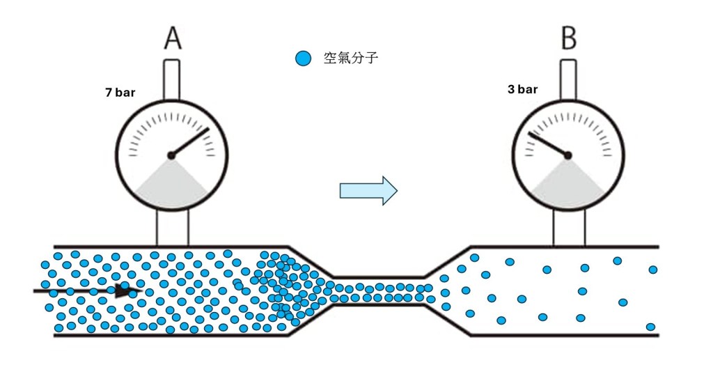 下列第一張示意圖與第二張、第三張實際客戶現場照片是很典型造成壓力損失的狀況;示意圖左側是空氣分子7 bar壓力壓縮後的密度(濃度),管路變狹窄因為氣塞無法順暢流動,右側空間再變大後,空氣分子密度變小,壓力也會瞬間下降,尤其是設備瞬間耗氣變多時更容易發生。