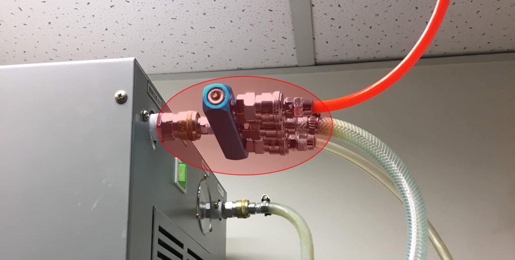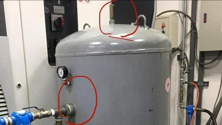 市面五金機械行最常提供的分岐配氣塊為1/4″入口再分出四組1/4″的母快插頭供使用端使用;從照片中可以看出冷凍式乾燥機出口為 Rc 1/2″ 出口接 1/2″ PT 母快插頭,立即由1/2″口徑縮管50 %成為1/4″口徑提供給合計1″的接氣管路使用,用戶在用氣量較大的設備因為壓力震盪且壓力過低導致低壓告警停機。