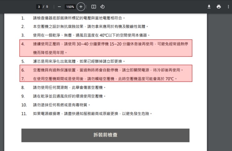 最大的使用限制就是無法持續運轉;例如:客戶那台商用型空壓機實際照片有註明讓客戶知道只能間歇性使用,但是大部份品牌不會註明。