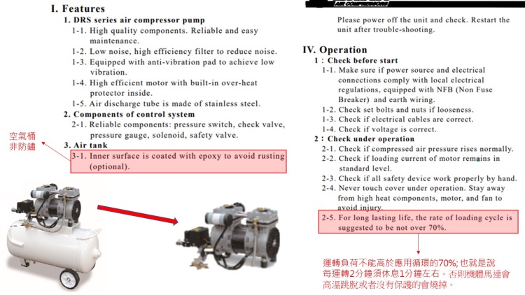 並不是它不好,而是使用它的場合工況適不適合的問題;就像照片裡的這台商用型空壓機有良心地提醒:「非工業用空壓機,限間歇性使用,無法長時間運轉」。