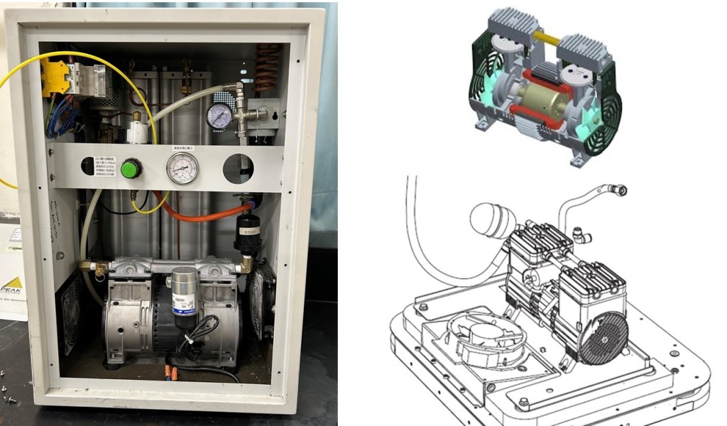 如果這樣的設計是應用在空壓機系統持續運轉Cycle低於70% (也就是說空壓機啟動運轉35分鐘必須讓它停機休息15分鐘,或者啟動17.5分鐘必須讓它停機休息7.5分鐘),或者更低並考慮空間的熱氣溫度與排風設計,則可以考慮採用內置空壓機系統製程或診療設備。(請參考第一張照片空壓機表示該商用型空壓機只能間歇性使用,無法長時間持續使用)。