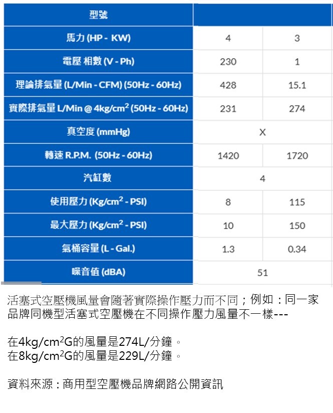 日本岩田 3馬力 (2.2kW) 工業級無油渦卷式空壓機在0.8MPa (約8.16 kg/cm2G) 下,實際排氣量為255L/分鐘;姑且不論能否長期全天候持續運轉供氣,較上述4馬力商用型活塞式空壓機在 8 kg/cm2G 壓力下的229L/分鐘,能效高出48.5%以上 (從高出的風量與少掉的馬達功率計算)。