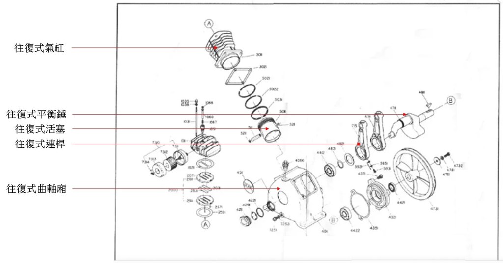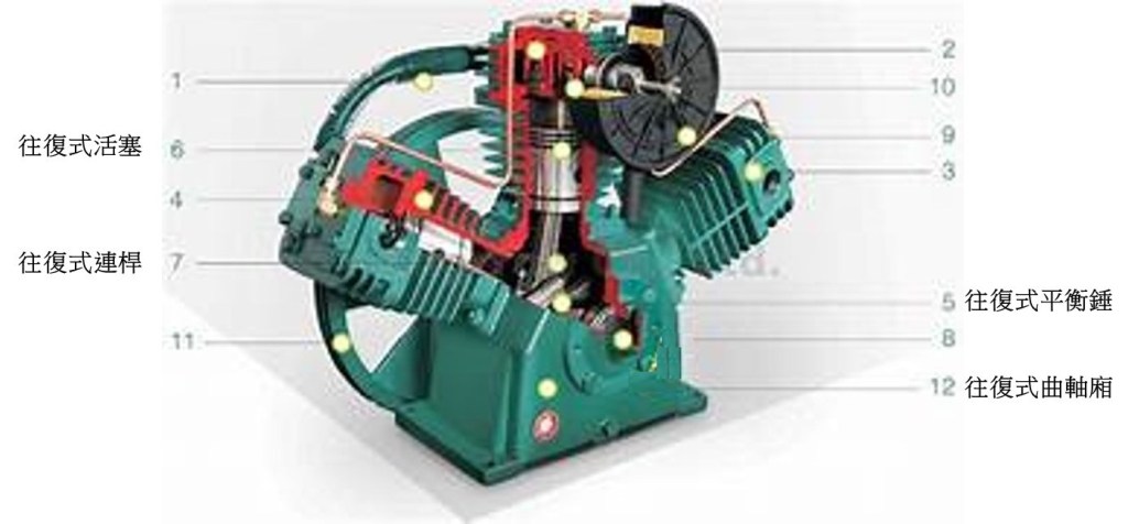 我們可以借用其他工業級往復式空壓機實際機體的解剖圖來看看工業級往復式空壓機的機體主要結構狀況:請特別它與活塞式空壓機都有的 活塞、氣缸、連桿以及活塞式空壓機沒有的平衡錘與曲軸箱。