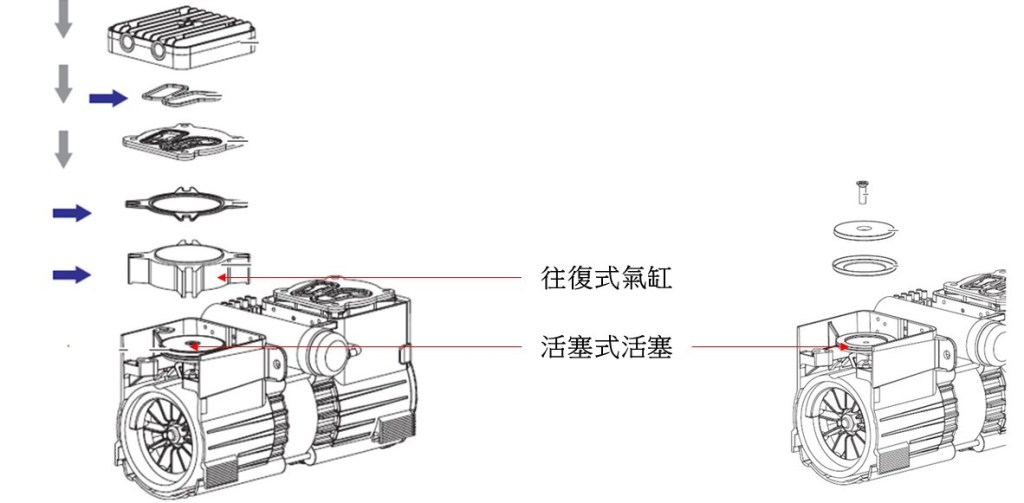 各位牙科前輩可以很容易在活塞與氣缸就發現其大小與結構與商用型活塞式空壓機有很大的差異,這其中還不包括看不到的 “加工精度",工業型為了避免氣缸與活塞壓縮時壓縮空氣從高壓側回漏至低壓側需要更高精密的加工 (請參考下圖)。